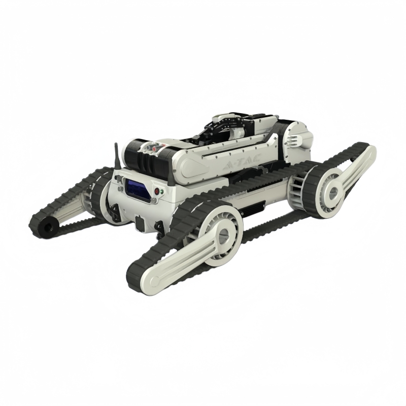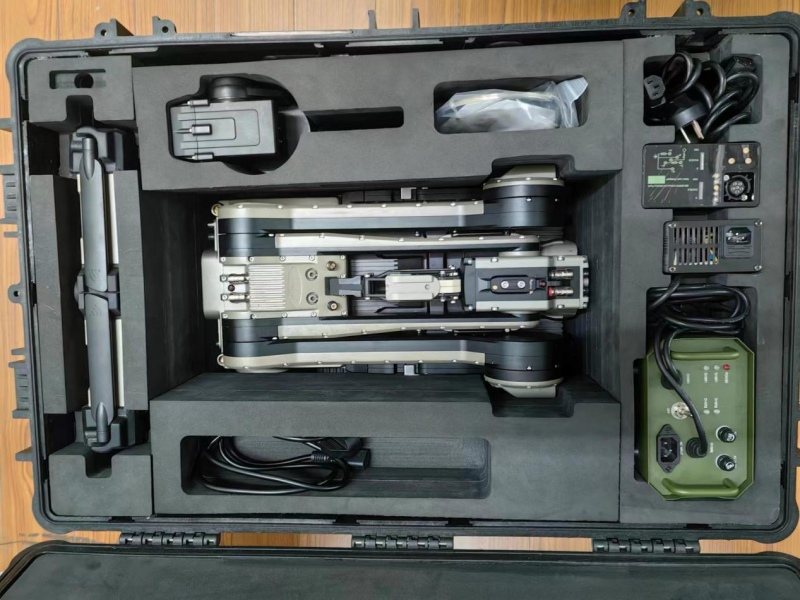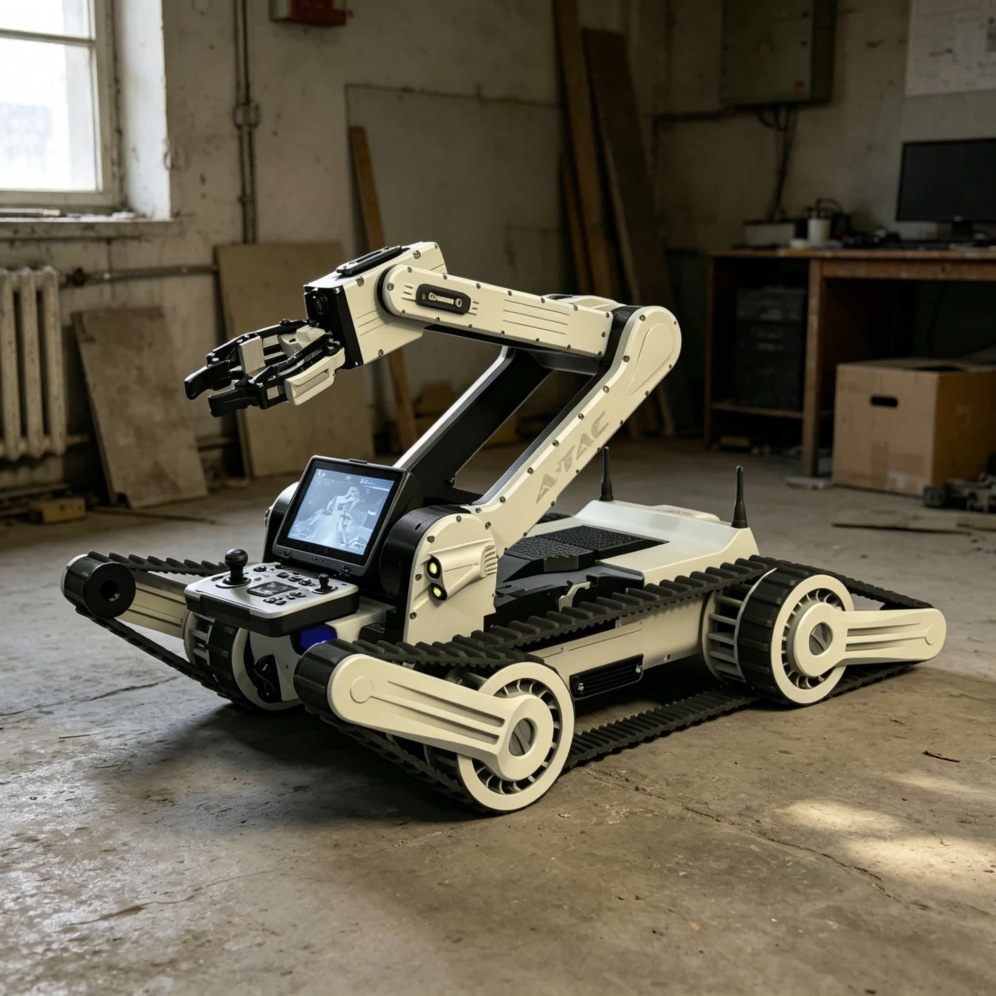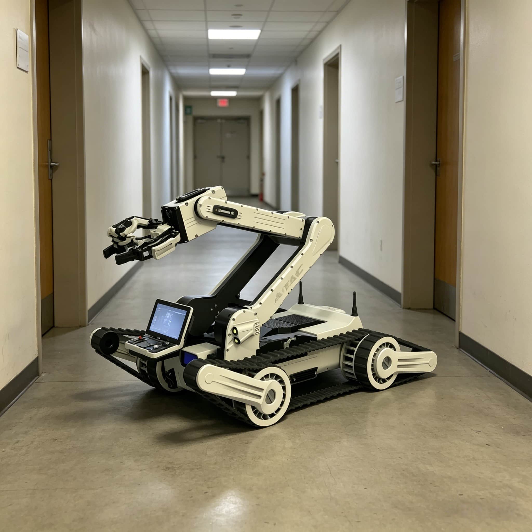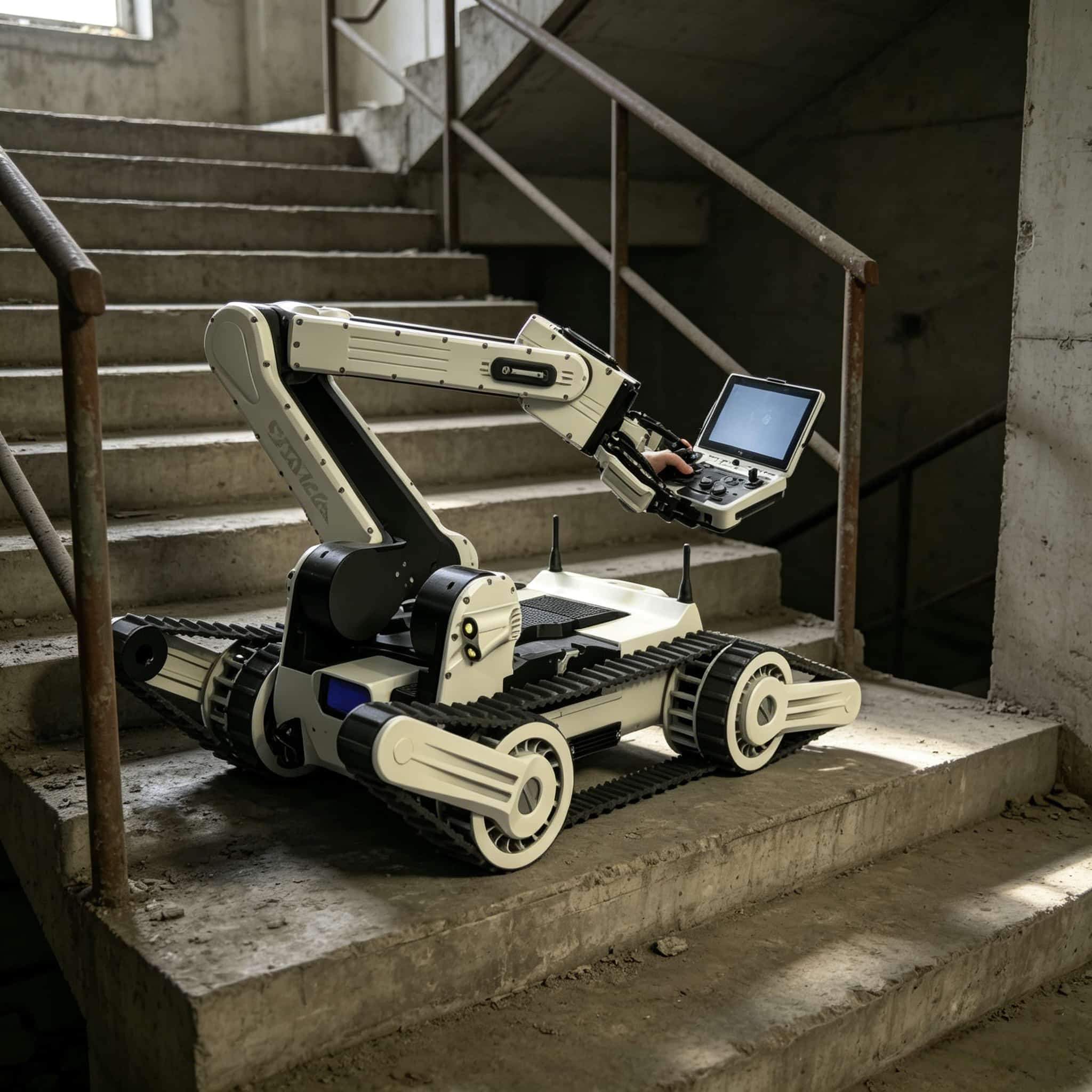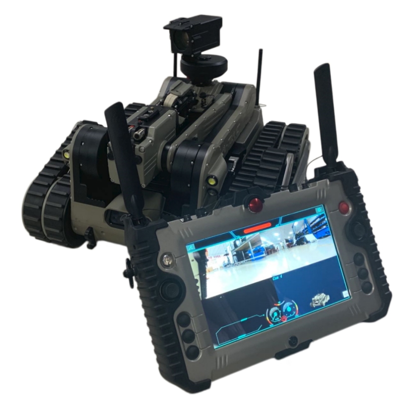 Small, lightweight EOD robot (20kg) ideal for indoor and staircase reconnaissance. 5-DOF manipulator, handheld controller with 10.1" screen, and modular design for easy maintenance.