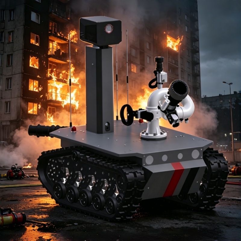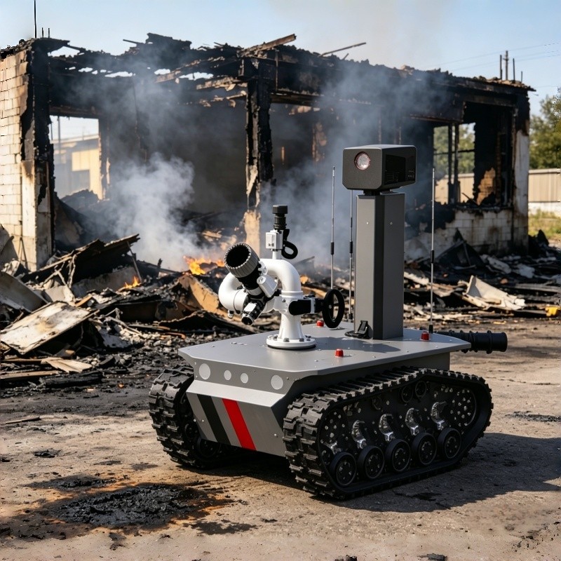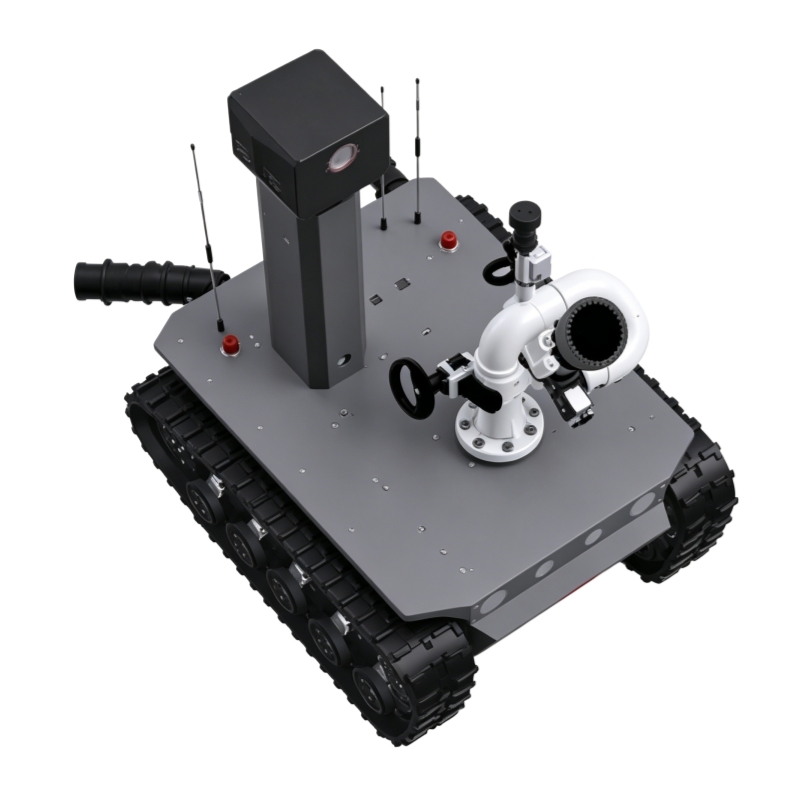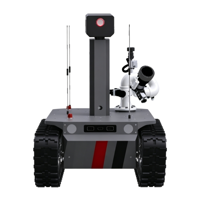 Ranger heavy duty firefighting and reconnaissance robot – 80L/s at 1.0MPa, 80m water range, 1000m remote control, 300kg towing, 200kg payload, and automatic obstacle avoidance. Built for oil refineries, chemical plants, and major industrial fires.