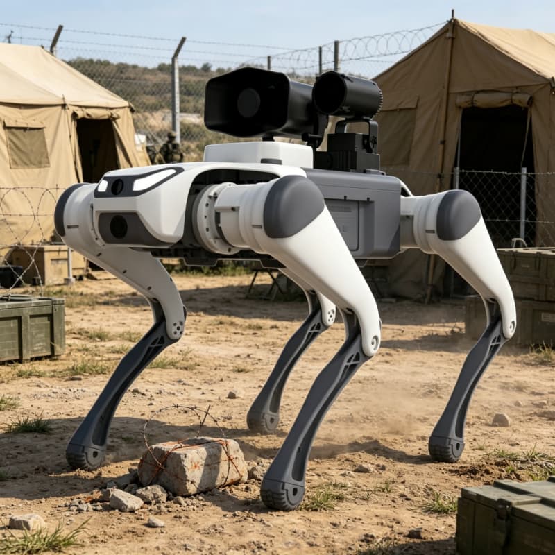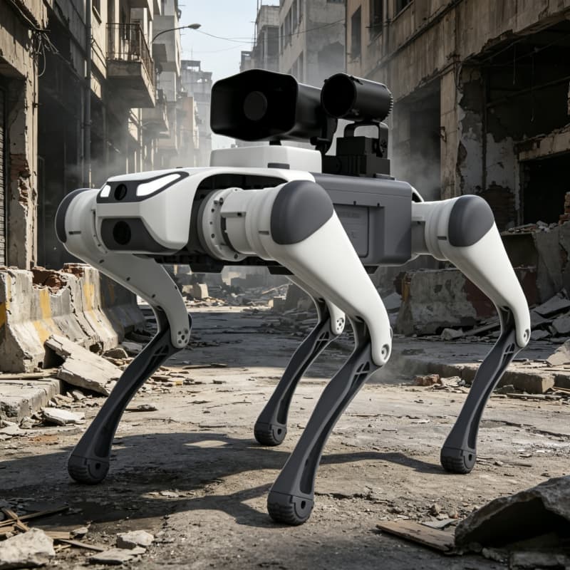 The small model (12.2kg) is agile and capable of jumping, making it ideal for indoor reconnaissance and tight-space operations.